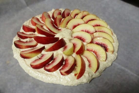 מסדרים את פלחי הפרי על הקצף, קודם את המעגל החיצוני, ואח"כ את המעגל הפנימי, מטביעים אותם מעט בתוך הקצף.