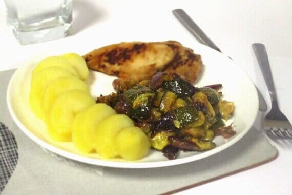 חותכים את הקישואים והבצל לקוביות, מניחים בתבנית תנור, מפזרים מעל 1-2 כפות שמן זית, ואופים עד להשחמה.